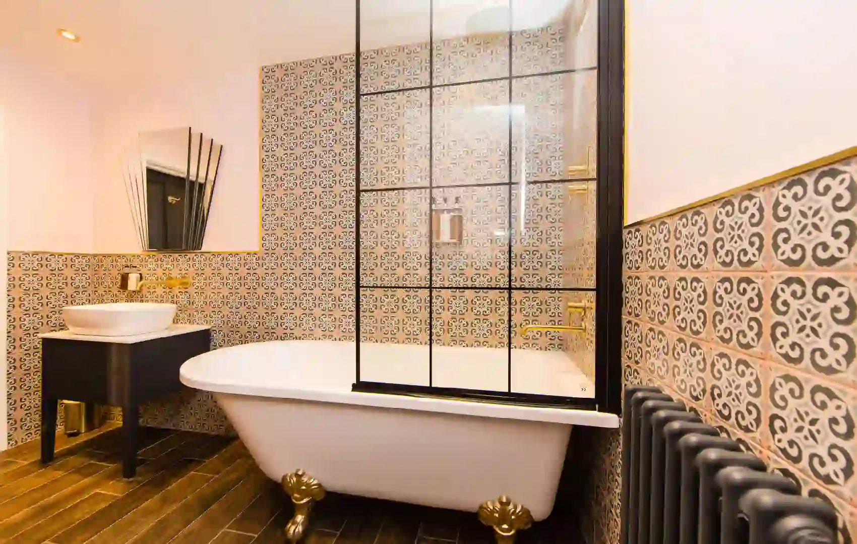 A compact but thoughtfully designed galley kitchen includes a Neff Oven / Microwave, induction hob, slim dishwasher, fridge with freezer compartment. There is a beautiful gold sink with composite marble worktop and lots of cooking utensils, pans manual espresso machine etc.Bathroom: