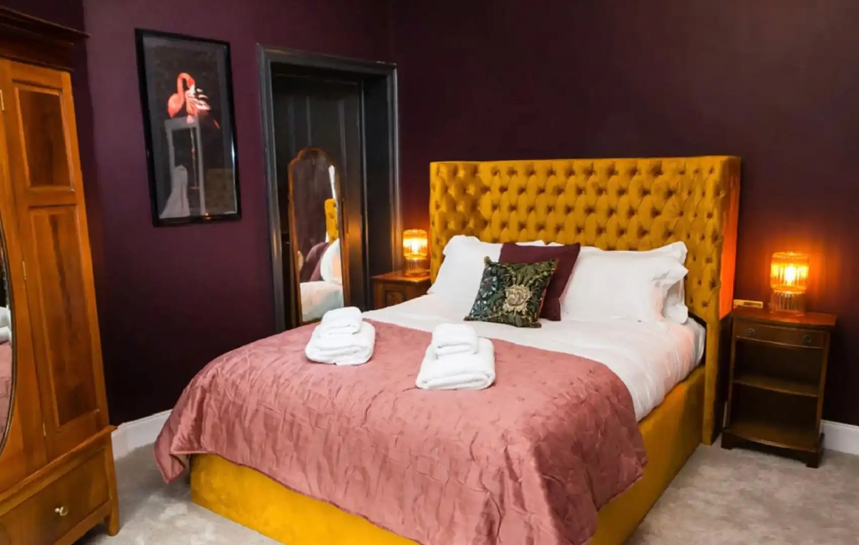 The grand bedroom features a gorgeous freestanding bath on a porcelain tiled platform, deep luxurious carpets, sensational gold velvet wing back headboard, fine linens,and large antique wardrobe.Bathroom:
