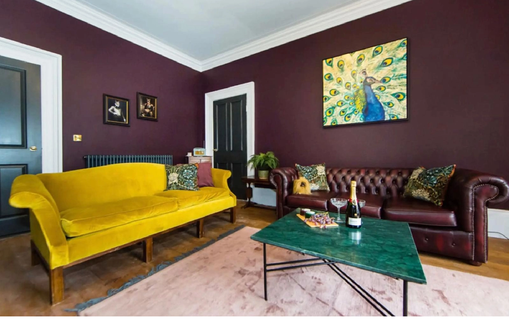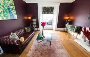 A very large sitting room with high ceilings, original features, stripped wooden floor, with two three seater settees, one of which is a sofa bed with thick mattress topper. There is lots of space to socialise with your guests, and a wide variety of antique and contemporary furniture. A variety of lighting choices will allow you to set the mood for your stay. There is also a large 58' Panasonic 4k Smart TV with Netflix, plus you can also stream your apps from your mobile devices.Large Bedroom: